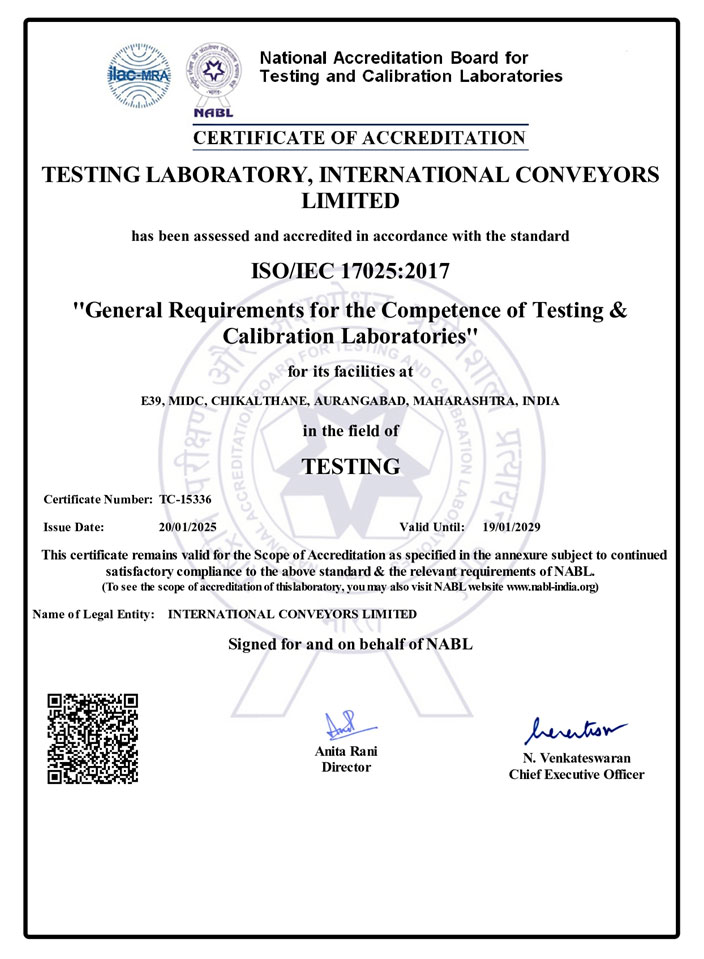 We are the only PVC Conveyor Belt Manufacturer in India whose lalaboratory is accredited under ISO/IEC 17025:2017 standards by the National Accreditation Board for Testing and Calibration Laboratories (NABL), an autonomous body setup under Department for Promotion of Industry and Internal Trade (DPIIT), Ministry of Commerce and Industry, Government of India.
